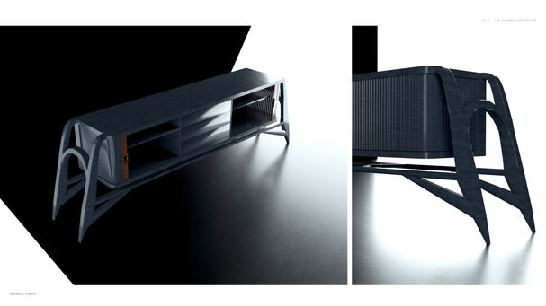 This bespoke chest of drawers is influenced by our Shokunin Bar Cabinet. The distinctive silhouette can be seen in the suspended, graceful curve of the chest. Layered shades of deep blacks and greys echo the Japanese lattice pattern, Koshi, a meticulous style, interwoven with warm copper detailing. The solid copper and black leather handles complete the piece, balancing intricacy with striking simplicity.